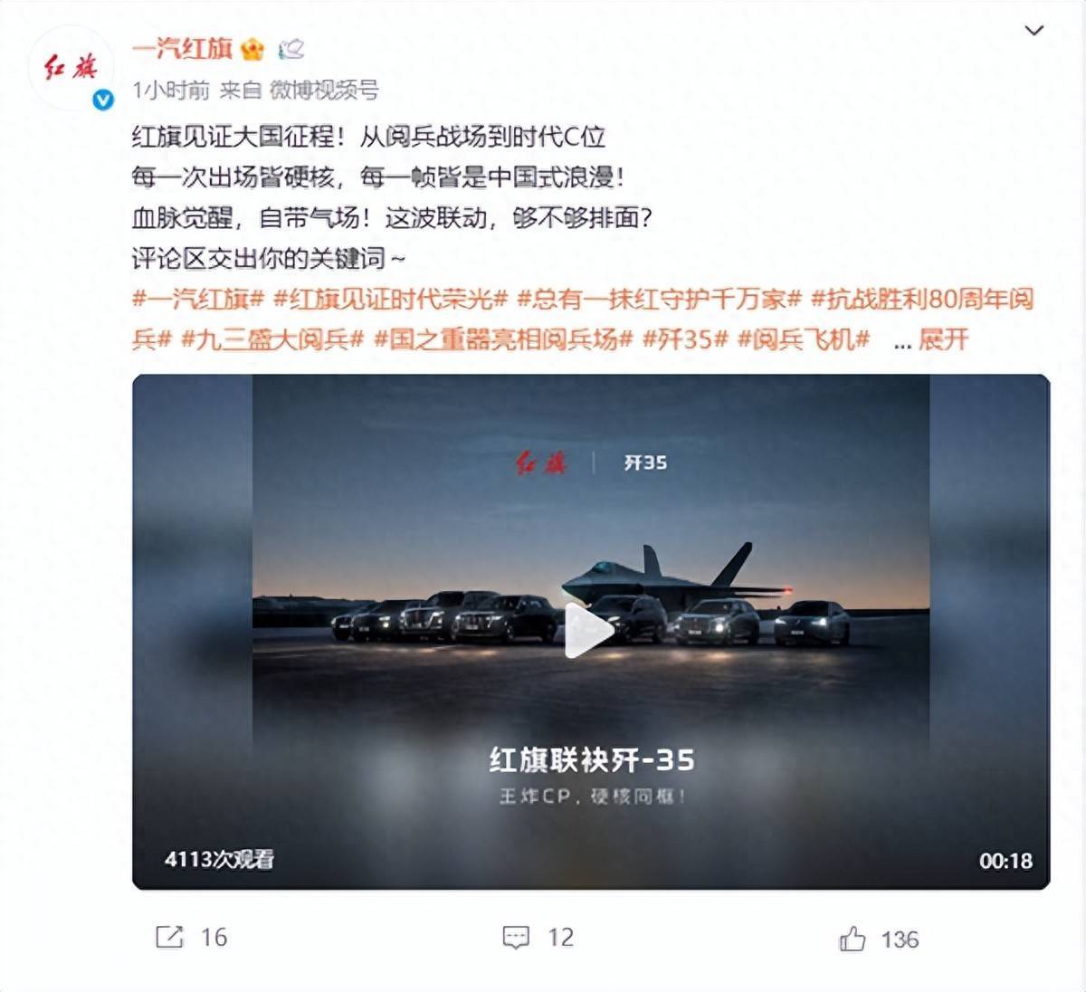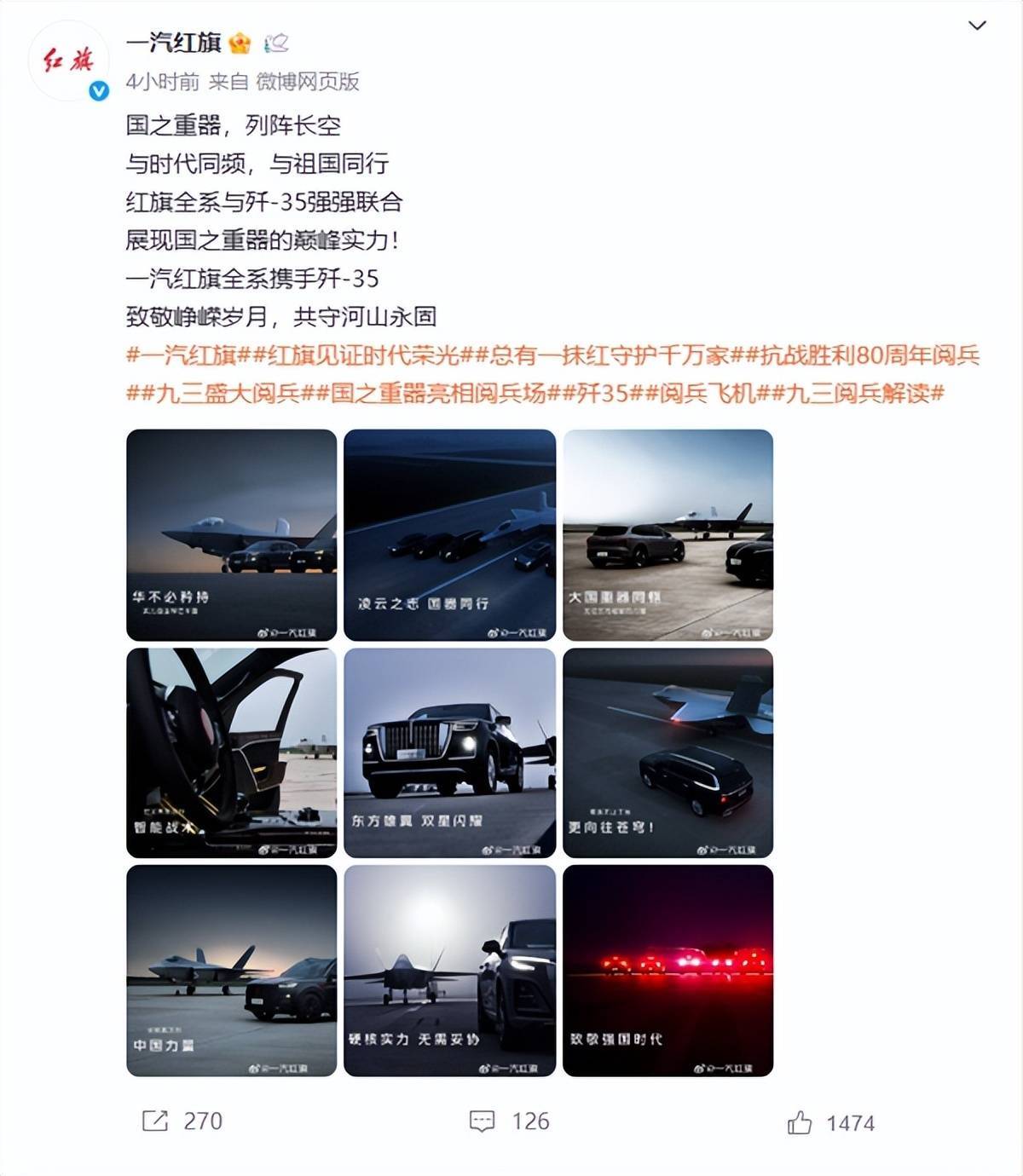 本日,一汽红旗在微博发布多组相片,红旗全系汽车与歼-35强强蚁集。